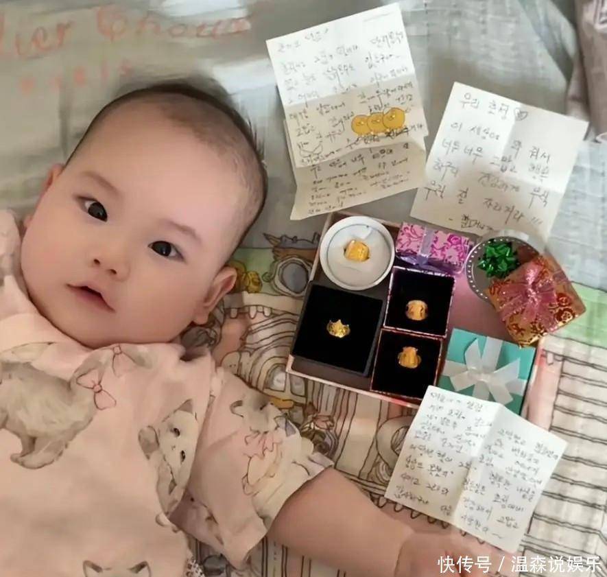 宝宝幸福了虽然张檬的儿子看起来没有太大,但是这不影响韩国亲戚们给孩子带礼物。只见张檬晒出来的婆婆携带的礼物中金子做的首饰就有四样,其中还有一些亲戚给孩子手写信祝福。不难看出,张檬虽然不经常去韩国,但是男方的家属对于张檬还是很看重的。